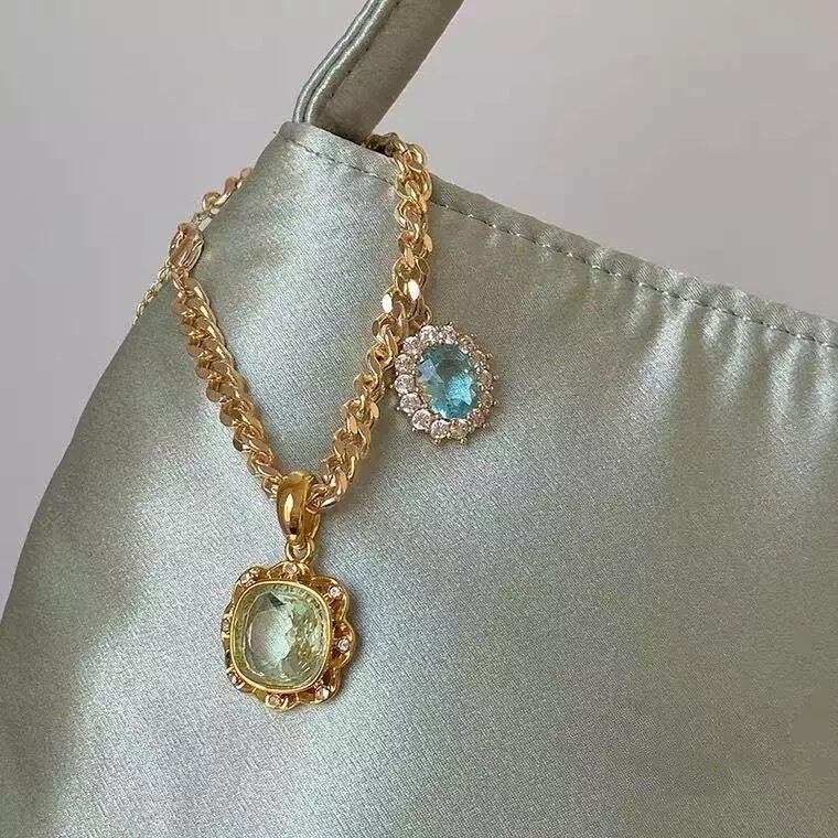 ゴールドのチェーンにブルーとグリーンのビジューが映えるブレスレットです(*´꒳`*)